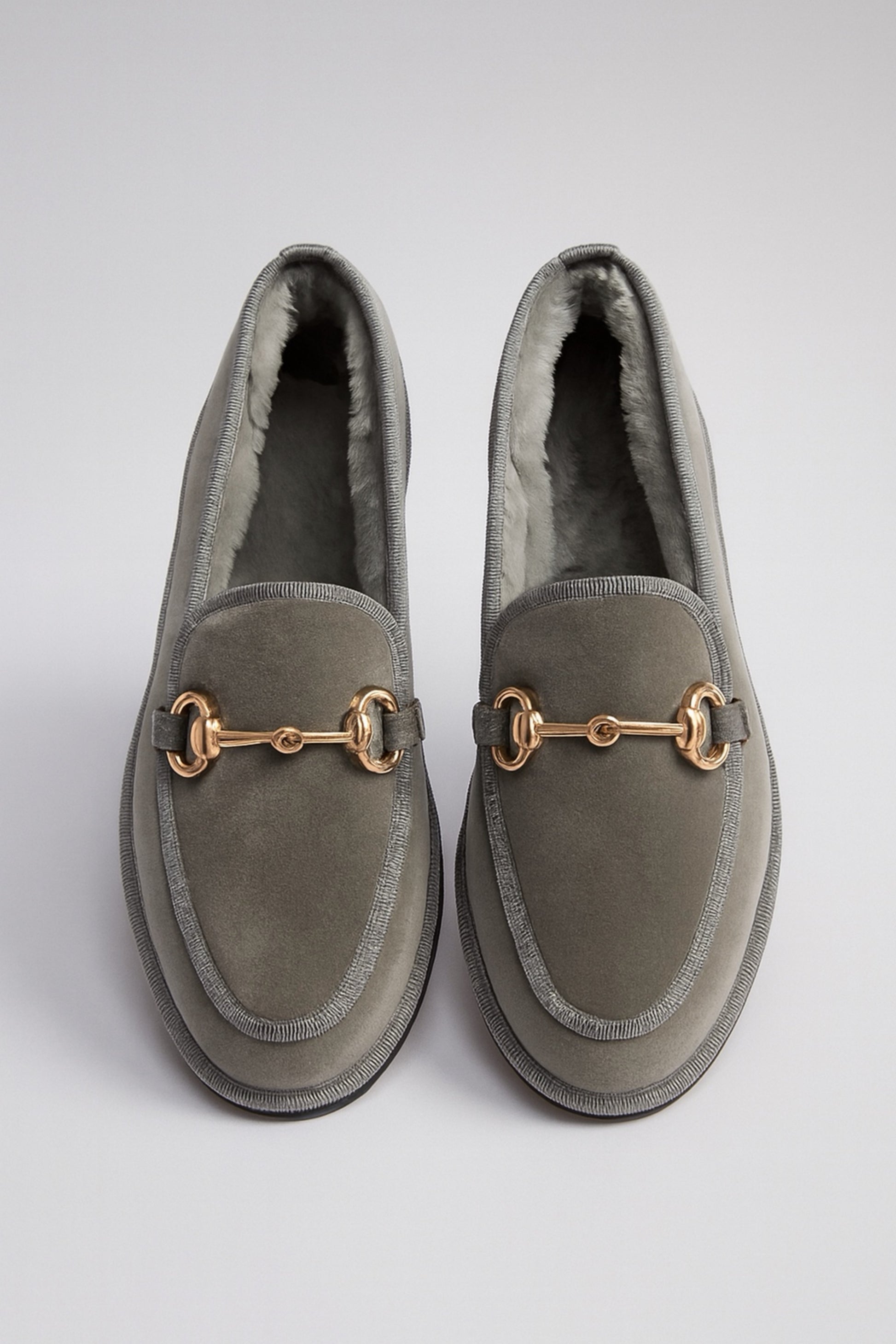 Der Hausschuh aus der Leoncini Collection präsentiert sich in einem eleganten Grauton und kombiniert klassisches Design mit modernen Akzenten. Die samtige Oberfläche verleiht dem Schuh eine ansprechende Haptik, während die goldfarbene Schnalle einen luxuriösen Touch hinzufügt.